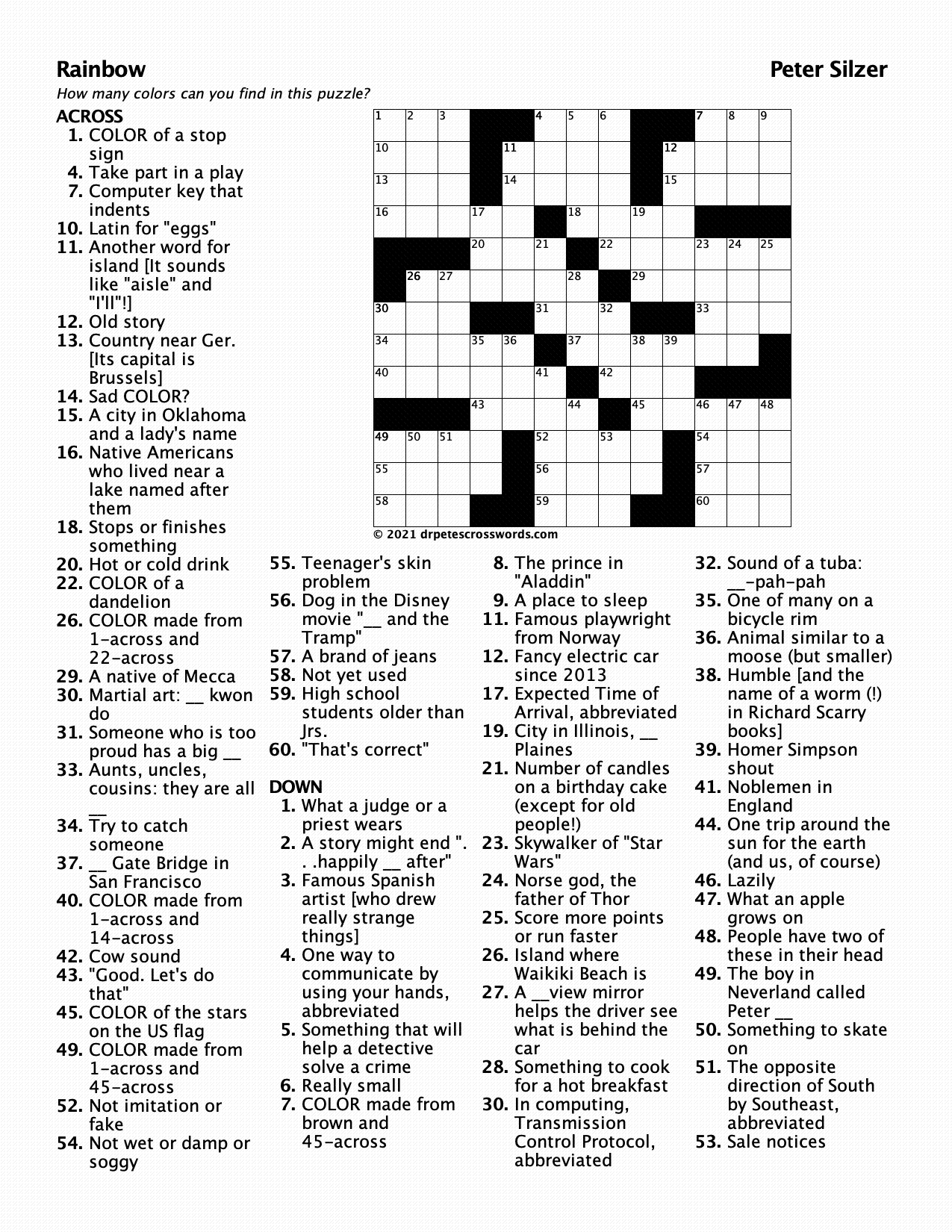 You can solve the puzzle (and many others) online at crossword.info/drpete or print the puzzle and solution from this page.