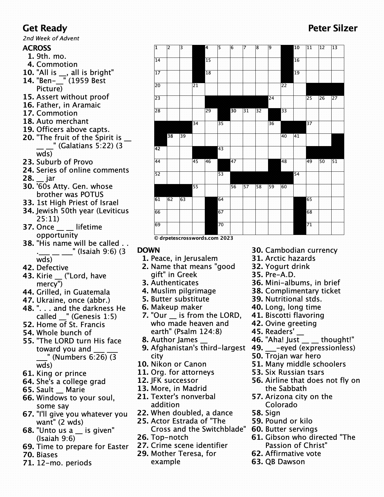 The theme of the 2nd week of Advent in the Christian preparation for the birth of Jesus is PEACE. I hope my crossword puzzle helps you consider the gift God has prepared for the world: Jesus, the Prince of Peace.