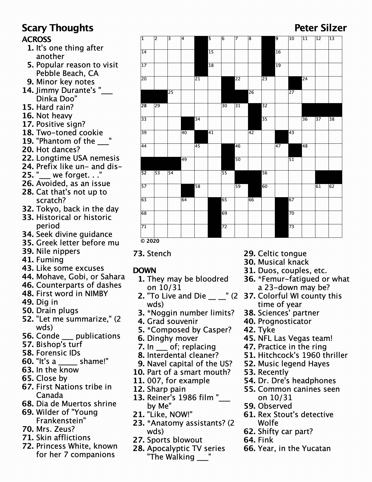 I often create puzzles for Halloween and other US holidays. This year's crossword includes 4 "theme" answers that each include a word related to Halloween. Don't be scared.